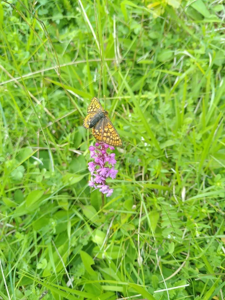 Deux spécimens rares à préserver : le damier de la succise s’est posé sur une orchis moucheron. © Domaine sauvage Le Costil