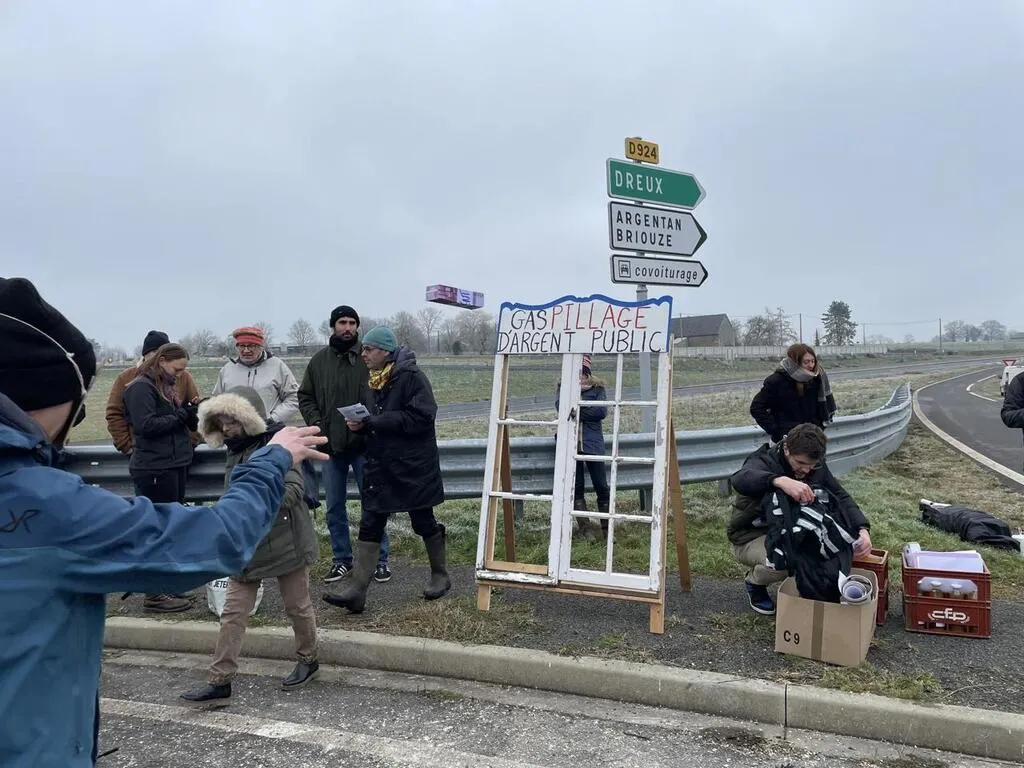 « Bienvenue sur l’échangeur de l’inutilité ! » Samedi 13 et dimanche 14 janvier 2024, le collectif 924, qui s’oppose à la construction du dernier tronçon de la 2x2 voies Flers-Argentan, entre Briouze et Sevrai, accueillait des membres du collectif national la Déroute des routes. Ce dernier regroupe une soixantaine de collectifs opposés à la construction de route partout en France, comme GCO non-merci, à Strasbourg ; La voie est libre, contre l’A69 Castres-Toulouse ou le collectif 972, entre Saint-Lô et Coutances (Manche).