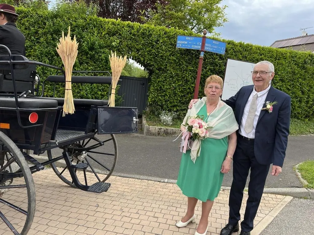 Françoise et Jean Legac ont fêté leurs noces d’or en grande pompe, en arrivant en calèche à la mairie de Goulet (Orne). © Ouest-France