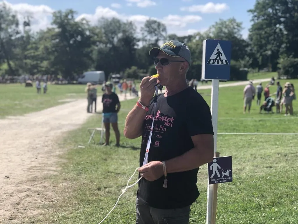 Dans le parc, le bruit des sabots, les commentaires sportifs et le son des sifflets résonnent en permanence. Philippe, bénévole tout le week-end, sécurise un passage piéton : il referme la barrière quand les cavaliers passent, et siffle pour avertir le public.