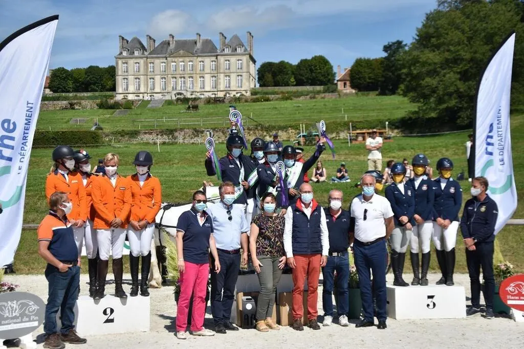 Le château du Haras du Pin derrière eux, les cavaliers brandissent fièrement leur coupe, tandis que la Marseillaise retentit dans tout le parc.