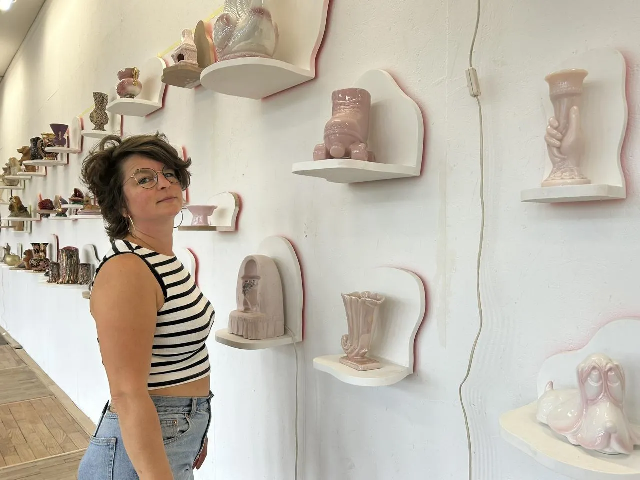 Grande chineuse d’objets, elle a mis sa passion au service de son art. « Pendant à peu près dix ans, j’ai accumulé des objets achetés en brocantes, vide-greniers et solderies. Des objets qui ne sont pas magnifiques. Ils sont moches et kitch clairement, explique-t-elle en rigolant. Puis un jour, j’ai trouvé un vase bizarre. Il a été le point de départ de tout. Je me suis mise à chiner pour mon art. J’ai considéré ces objets comme des rebuts, oubliés et démodés, qui méritent d’avoir un statut plus haut. C’est tout l’objet de cette exposition. »