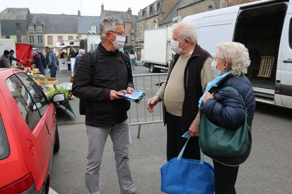 Hubert Chaillou, militant La République en marche du comité d’Argentan, discute avec un couple de retraités, mercredi 20 avril 2022, sur le marché de Carrouges, dans l’Orne. © Ouest-France