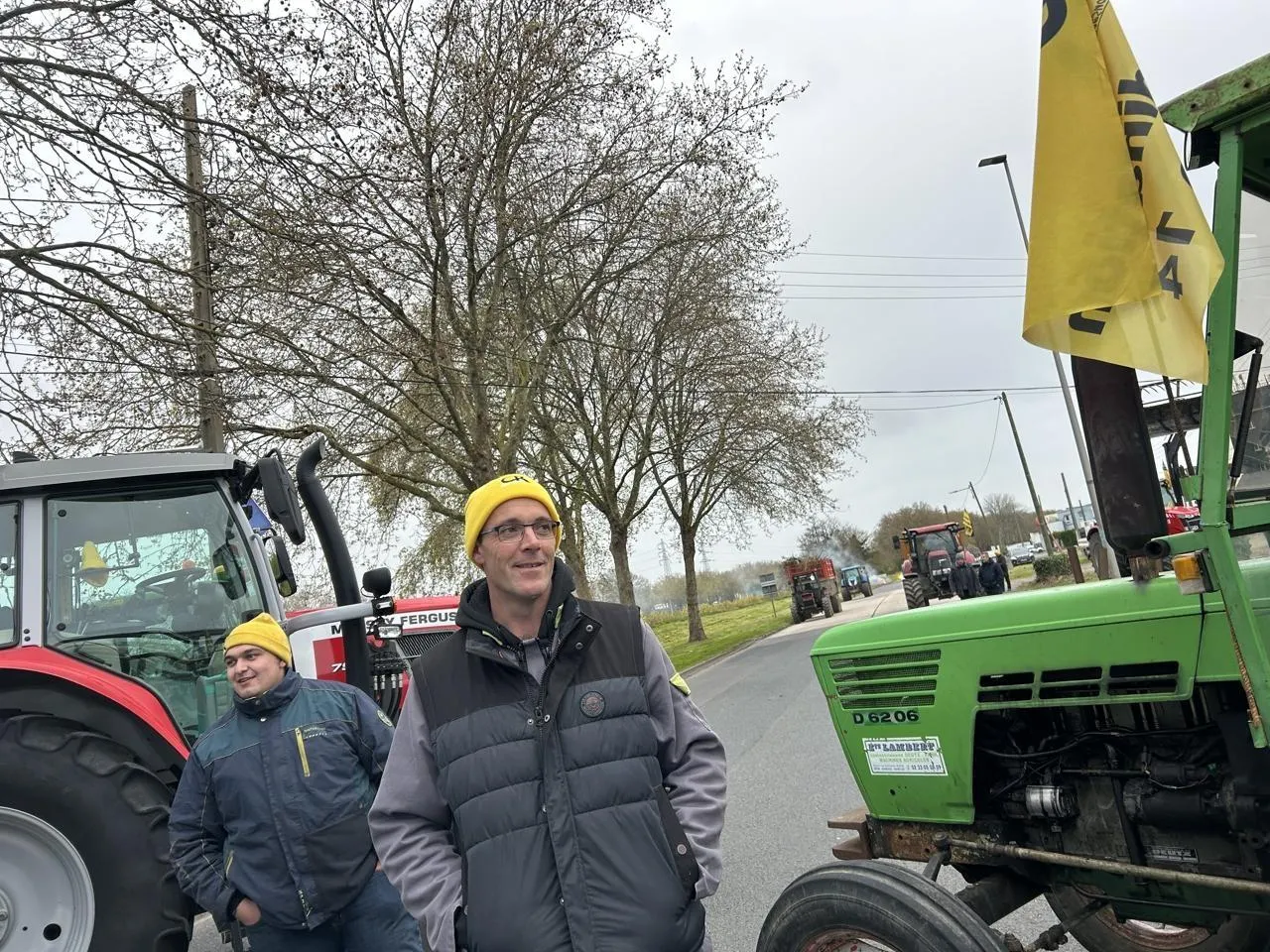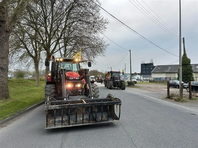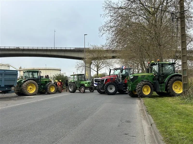 Une cinquantaine d’agriculteurs avec une dizaine de tracteurs sont positionnés devant le dépôt pétrolier Bolloré Energy, sur la Presqu’île à Caen (Calvados), ce mercredi 1er avril 2026. © Ouest-France