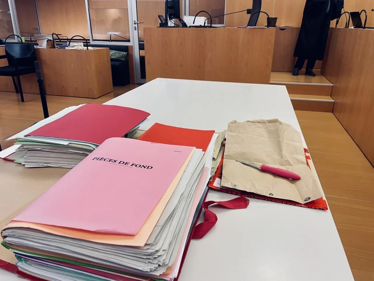 Mardi 25 novembre 2025, au deuxième jour du procès d’un coup de couteau mortel à Argences, devant la cour d’assises du Calvados, l’avocate des parties civiles, tout comme les experts, ont bousculé la version d’un geste involontaire. Ici, le couteau sorti des scellés, à côté du dossier criminel. © Ouest-France