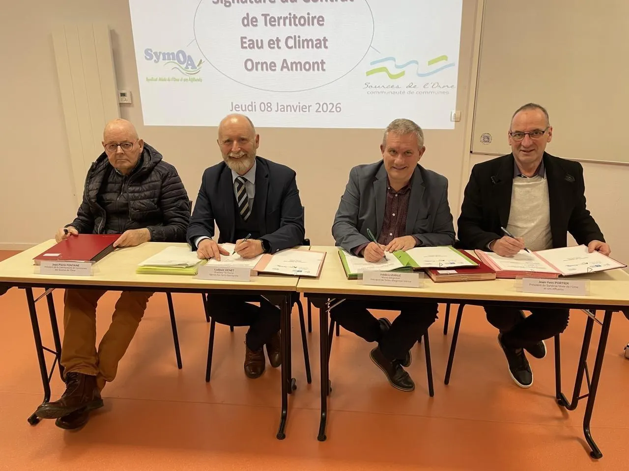 Le président de l’intercom des Sources de l’Orne, le directeur de l’Agence de l’eau, le président de Terres d’Argentan et celui du Syndicat mixte de l’Orne et de ses affluents ont signé le contrat de territoire jeudi 8 janvier. © Ouest-France