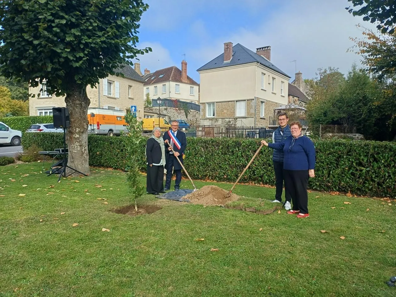 Dimanche 12 octobre 2025, place Notre Dame, Marie-Françoise Frouel, conseillère départementale de l’Orne, Sébastien Leroux, maire de la commune, Andrée Noël, présidente du comité d’animation et Clément Agostini, vice-président ont planté un chêne à l’occasion du 60e anniversaire de la fusion de Putanges et de Pont-Ecrépin. © Ouest-France
