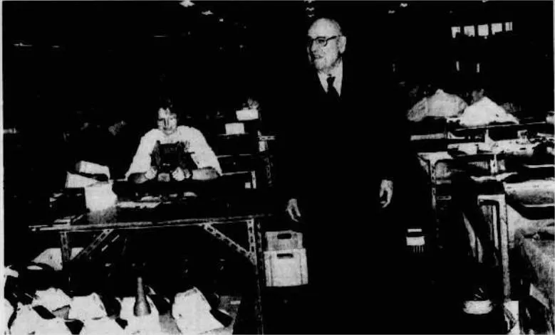 À l’intérieur de l’atelier de chaussures Moche en 1971 à La Ferté-Macé (Orne). © Archives Ouest-France