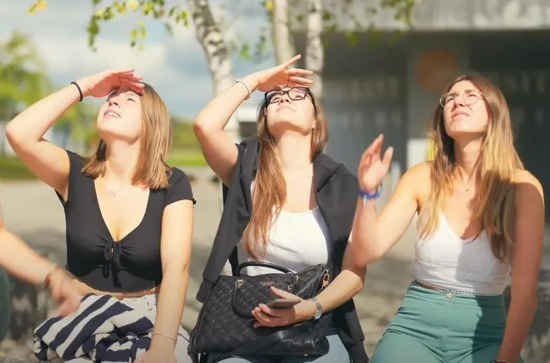 Un groupe d’étudiants et d’étudiantes a pris part au projet porté par In sitU web TV pour promouvoir le campus. Parmi ceux-ci, des figurantes qui suivent le drone des yeux. © In sitU TV