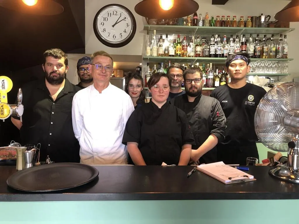 L’équipe du restaurant Le Comptoir de l’école accueille Rémi Hulin, Laurent Verrier, Aurélia Levêque et Mathieu Duvieux tous les jeudis. © Ouest-France