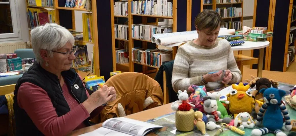 Un vendredi par mois, à la bibliothèque, Monique Cicé anime un atelier tricot et crochet avec une dizaine de participantes. Des petits personnages, des amigurumi (jouets rembourrés crochetés) sont réalisés au crochet ainsi que des couvertures en carré de tricot qui sont utilisées par Catherine de Rivaz, responsable de la bibliothèque, lorsqu’elle raconte des histoires aux enfants. Le prochain atelier se déroulera vendredi 22 décembre, de 18 h 30 à 20 h 30. © Ouest-France