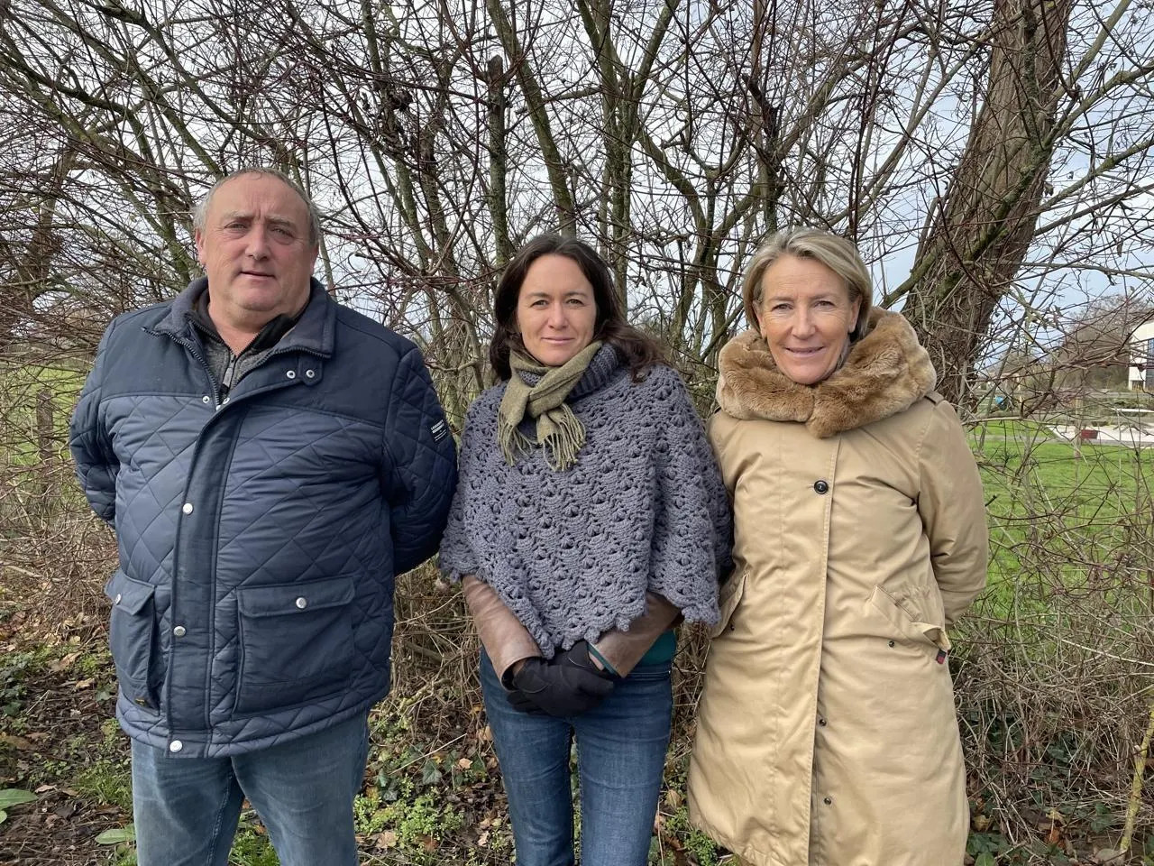 Samuel Dumas, maire, et Catherine Lévêque, première adjointe de Saint-Loup-Hors, entourent Magali Cerles, écologue et experte en biodiversité, qui a accompagné le projet « A vos LOUPes naturellement ! » © Ouest-France