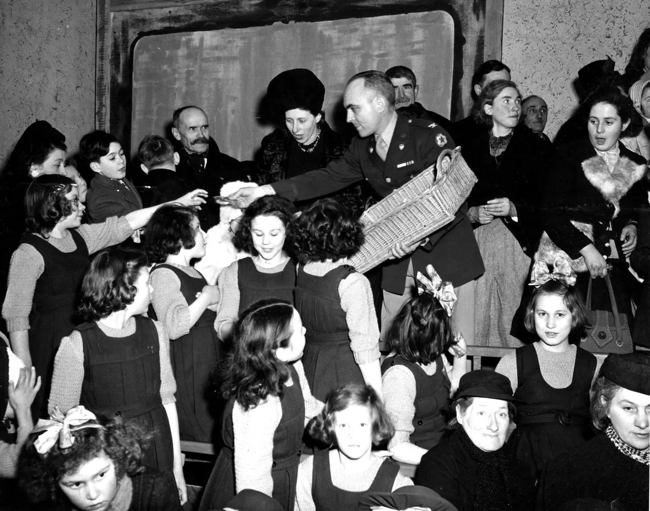 Au Havre (Seine-Maritime), un colonel états-unien passe parmi les orphelins de guerre, le 24 décembre 1944, avec un panier rempli de friandises lors de la fête de Noël organisée par les hommes et les officiers de la base du port. © Usis-Dite/Leemage (Photo by usis / leemage / Bridgeman Images via AFP)