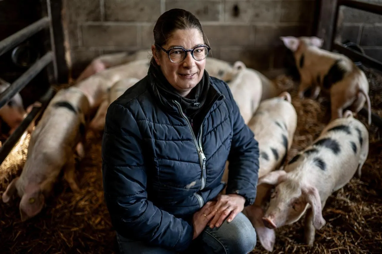 Christelle Marie, éleveuse de porcs de Bayeux, à Valambray (Calvados). Il n’y aura pas de concours cette année au salon de l’agriculture à Paris pour cette race à petit effectif, faute de participants, mais une présentation d’animaux. © Martin ROCHE