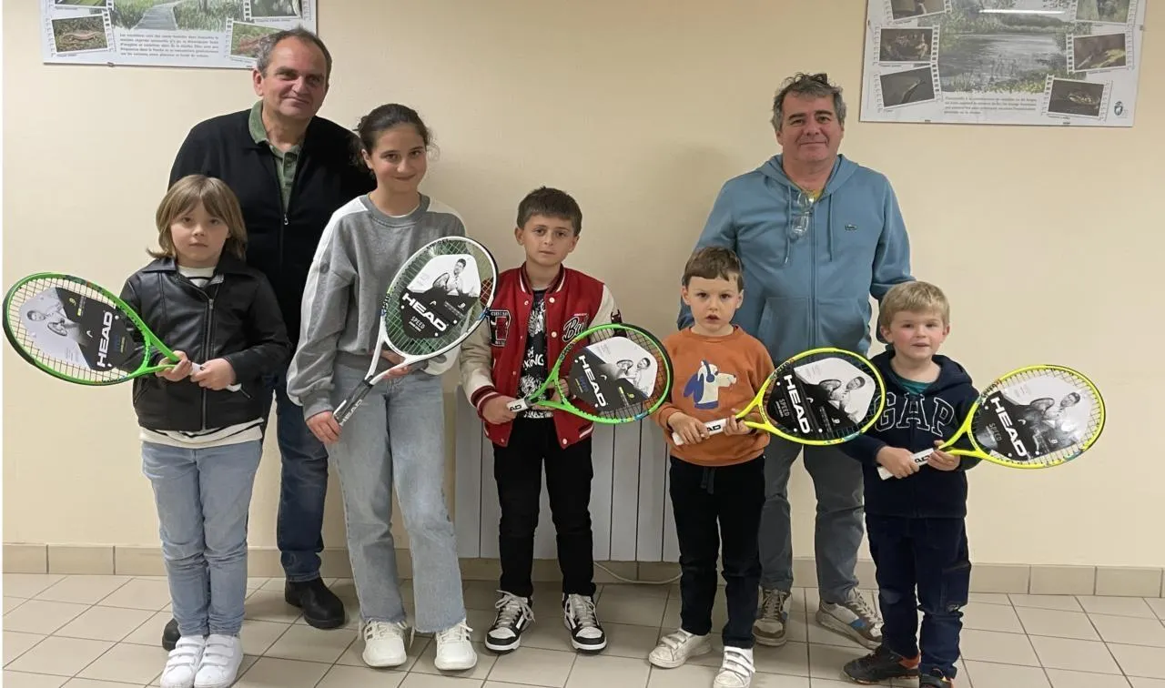 Jacques François et Guillaume Vramant avec les 5 enfants qui ont reçu une raquette : Léon Koning, Henri Demurger Santo, Léa Ciszewski, Arthur Marchand et Louise Boyer. © Ouest-France