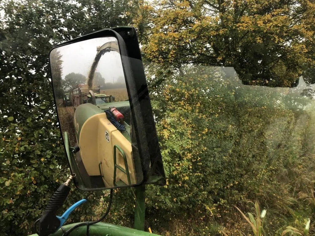 Dans le rétroviseur de l’ensileuse, son conducteur (qui n’a pas souhaité apparaître sur la photo) garde un Å“il sur le maïs qui se déverse dans les remorques, à Athis-Val-de-Rouvre (Orne). © Ouest-France
