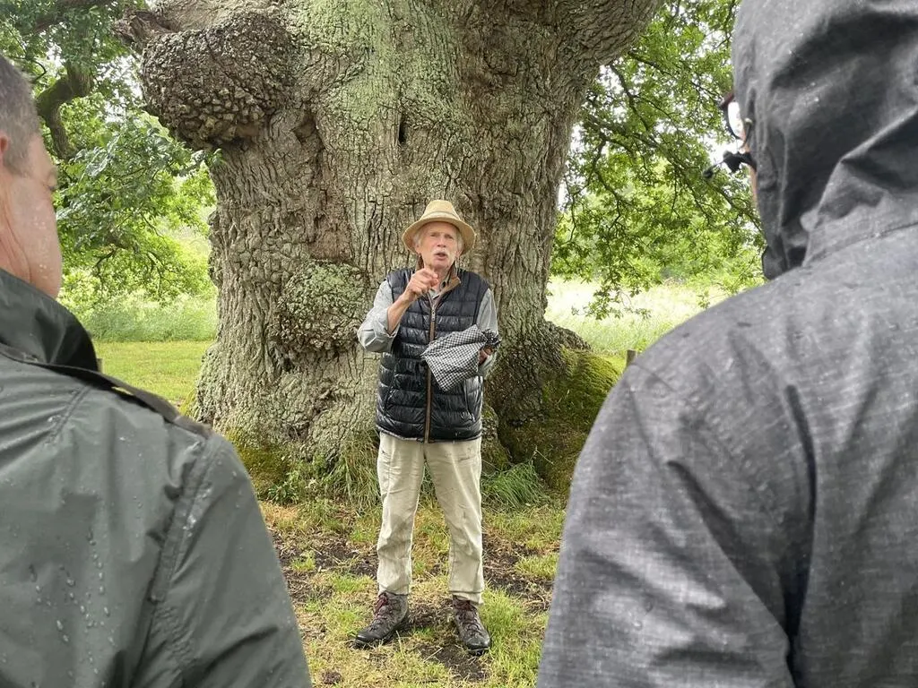 François Radigue, co-président de l’Association faune et flore de l’Orne, devant le chêne cinq fois centenaire de la propriété. © Ouest-France