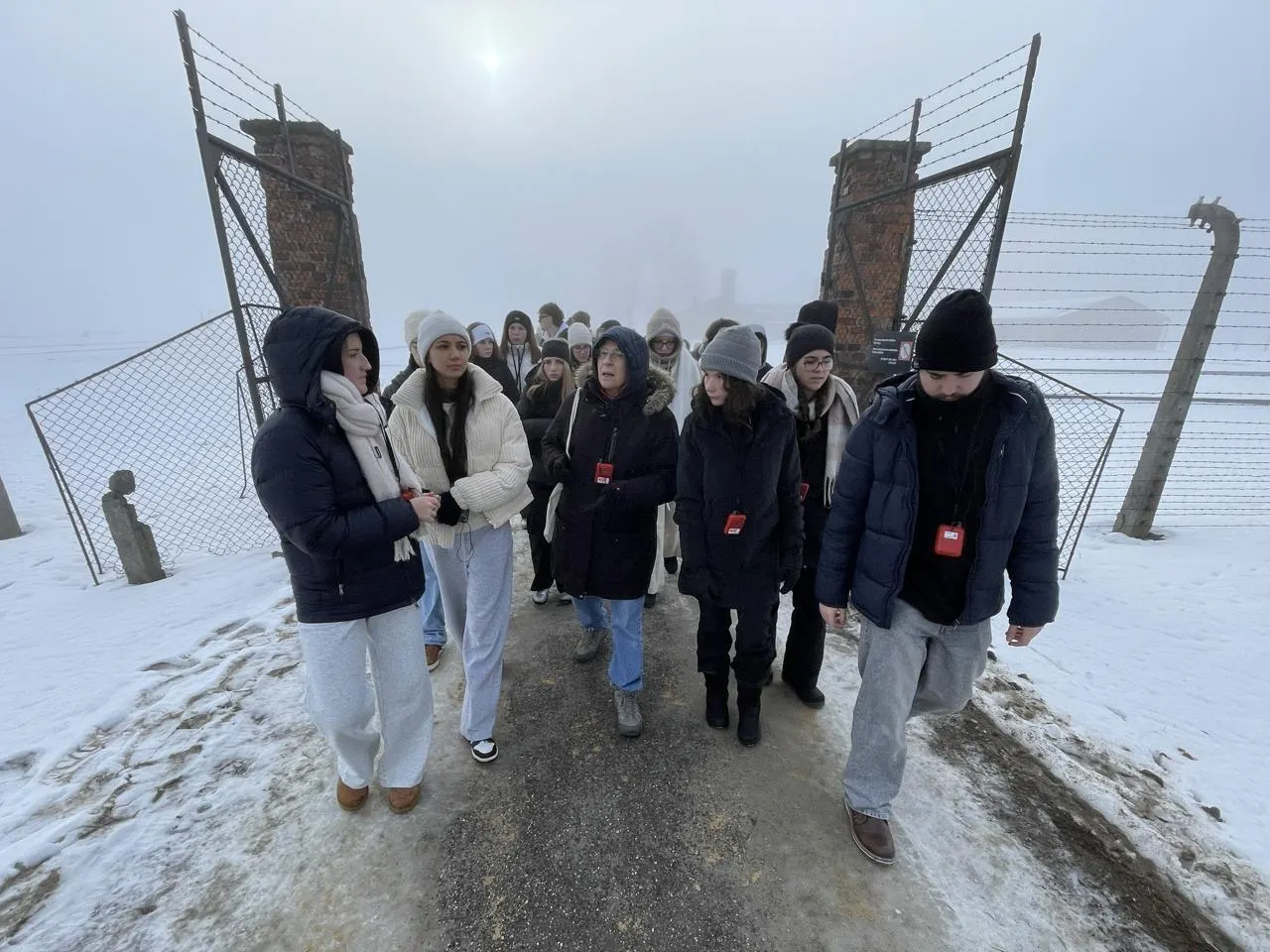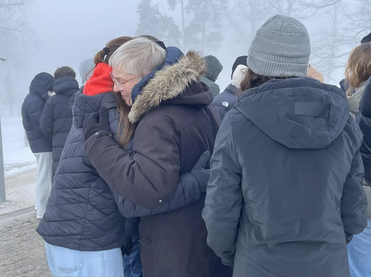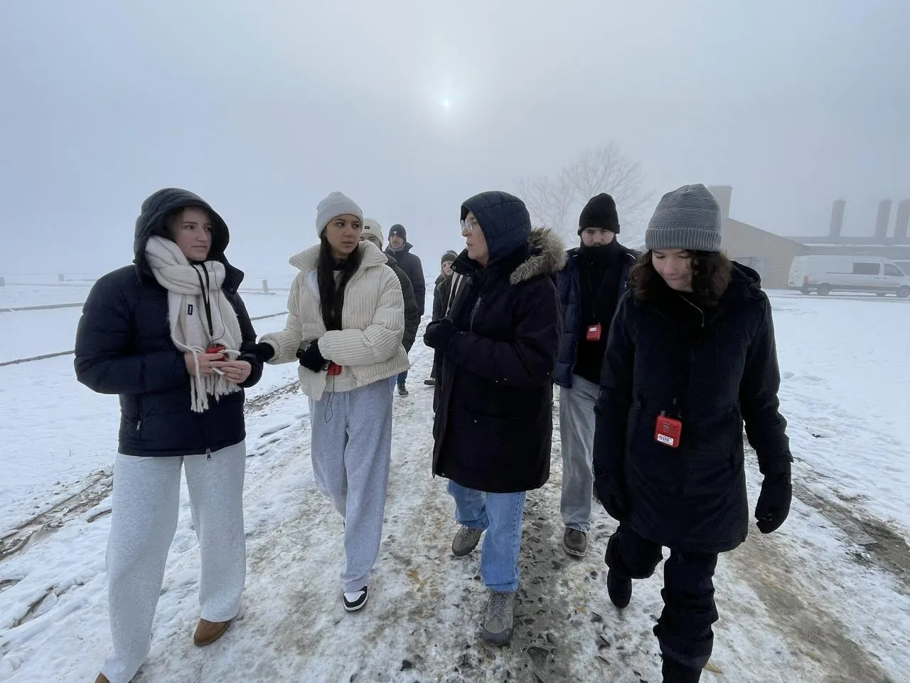 Lise Onijas, fille d’un rescapé de la rafle du Vél d’Hiv et de la Shoah, avec des lycéens de Fécamp (Seine-Maritime) au camp de Birkenau, en Pologne, jeudi 15 janvier 2026. © Ouest-France