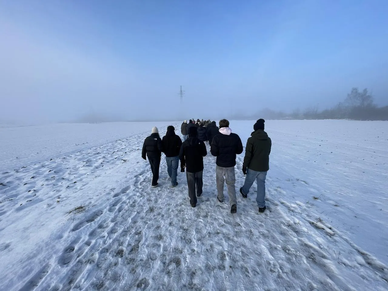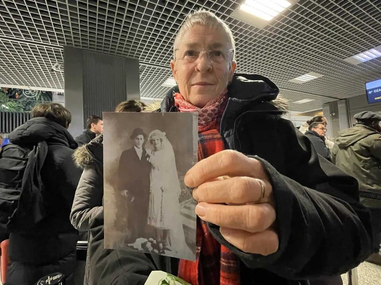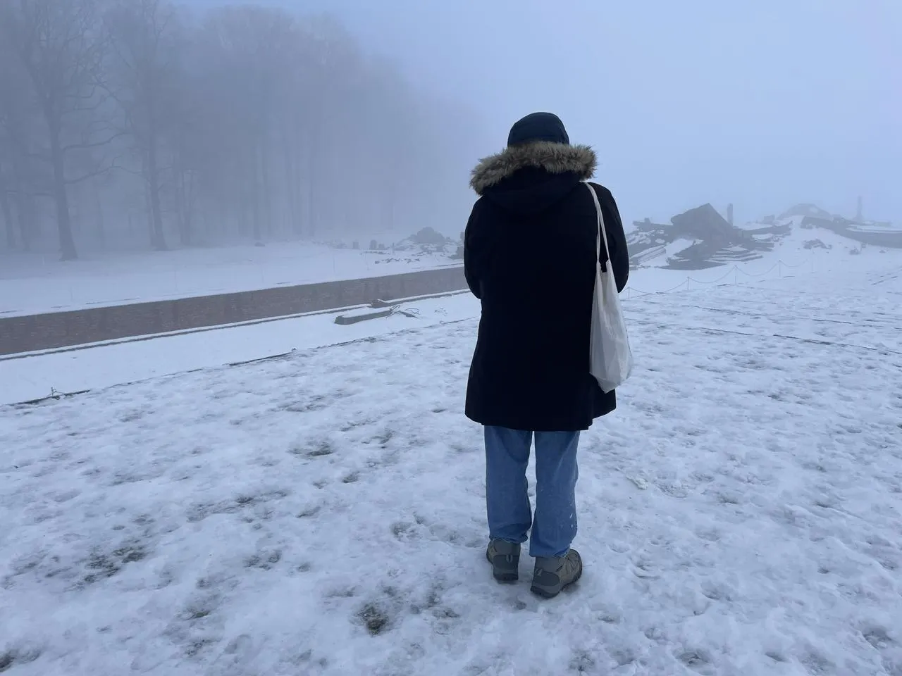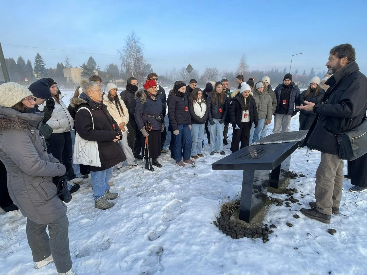 Lise Onijas, fille d’un rescapé de la rafle du Vél d’Hiv et de la Shoah, avec des lycéens de Fécamp (Seine-Maritime) au camp de Birkenau, en Pologne, jeudi 15 janvier 2026. © Ouest-France