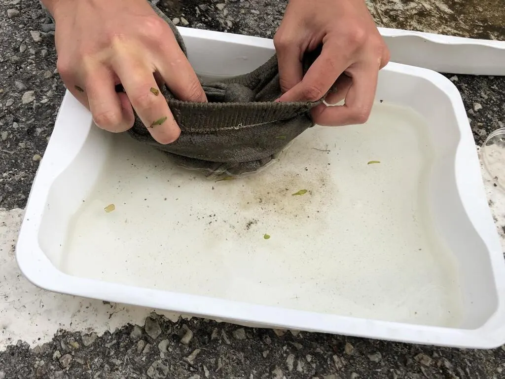 Le produit des prélèvements est précautionneusement déversé dans un bac, où seront comptés les micro-invertébrés de l’Aizy. Ouest-France