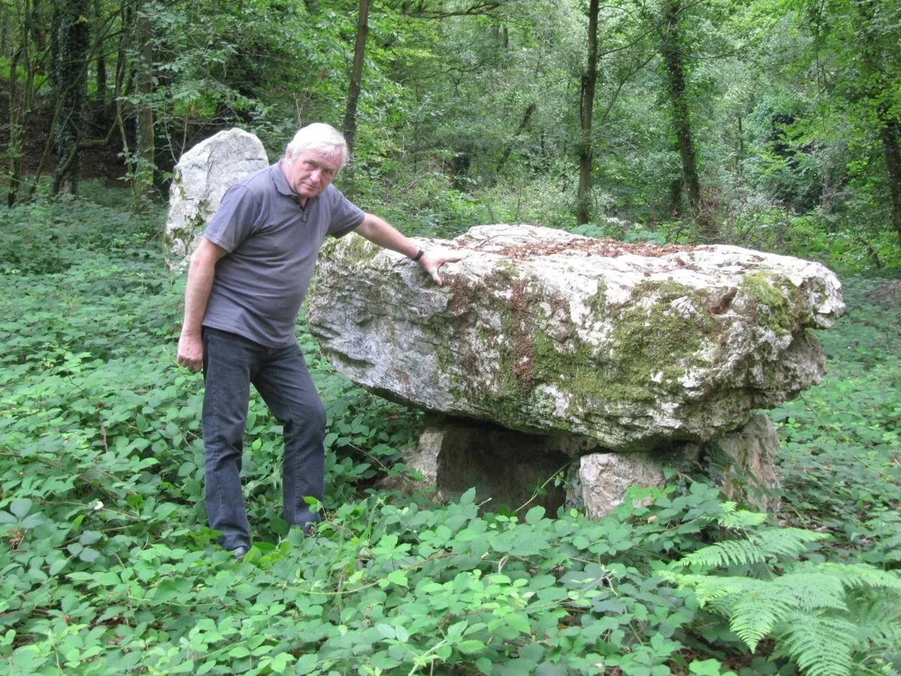 « Il est toujours debout il se situe par là -bas sous les arbres », pointe du doigt Claude Brard. « Cette fois par contre, il n’y a pas de chemin, personne ne doit y avoir été depuis longtemps », ajoute-t-il. À nos pieds, s’étend une mer de ronce, et la végétation nous empêche de voir l’ouvrage. « On va faire le tour », s’exclame le sexagénaire. Mais après une vingtaine de minutes, de nombreux détours et plein d’égratignures dues aux ronces, nous revenons, un peu par hasard à notre voiture, bredouille, sans avoir pu apercevoir le dolmen.
