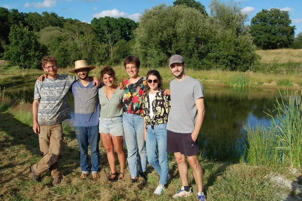 L’homme au chapeau de paille, Tom Rial, deuxième en partant de la gauche, entouré de quelques salariés, Guillaume Weissenberger, à gauche, Mathilde Hakoun, Juliette Douchin, Noémie Malaize (du magazine « Îlots ») © Ouest-France
