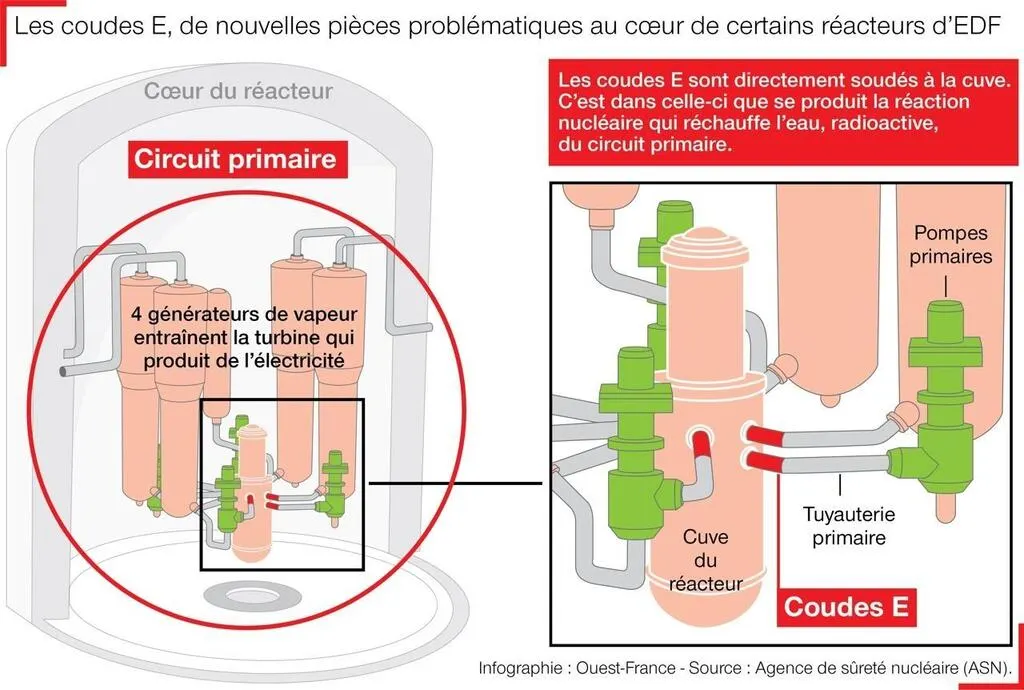 Problème, ces coudes sont directement soudés à la cuve du réacteur et font partie du circuit primaire qui véhicule l’eau radioactive, ce qui en fait des pièces difficilement remplaçablesÂ