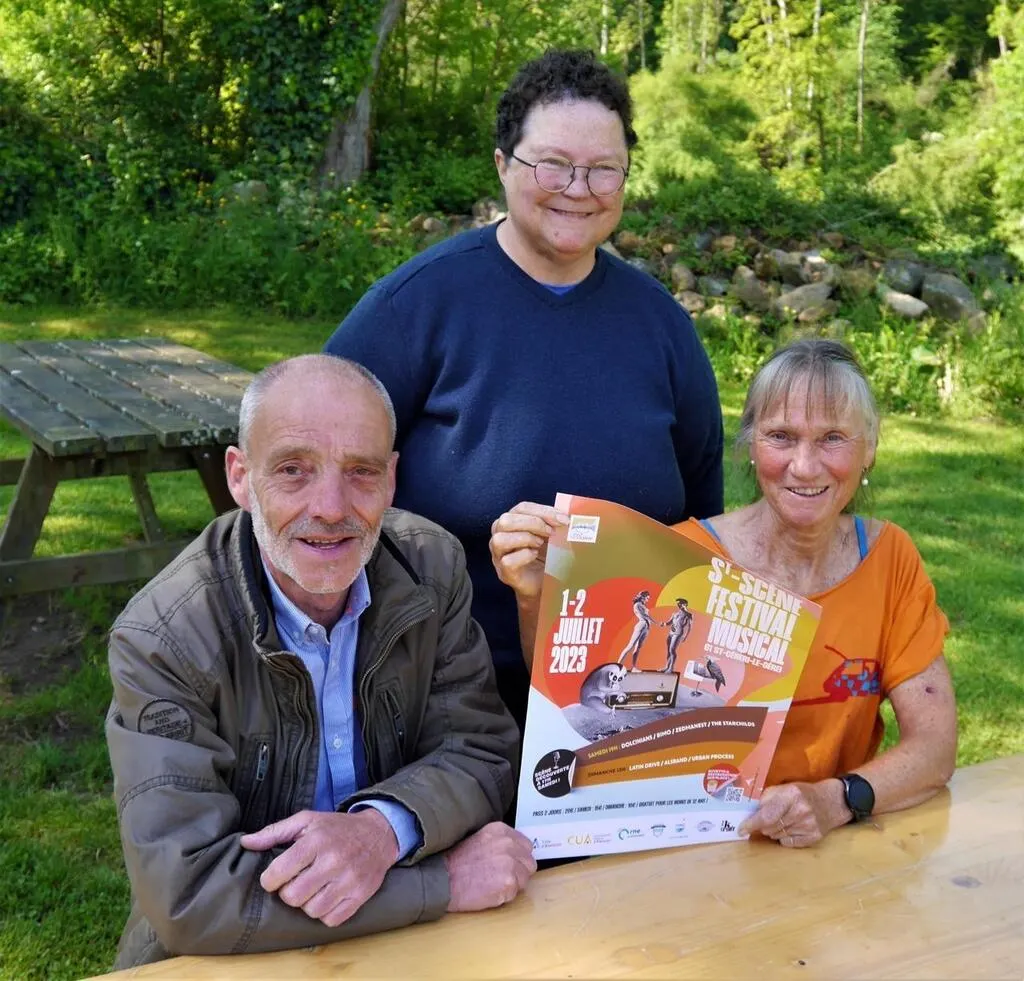 Le nouveau président de St-Scène, Marc Janin, avec Françoise Fernette, secrétaire et Frédérique Friot, vice-trésorière, debout avec la belle affiche du festival du 1er et 2 juillet 2023. © Ouest-France