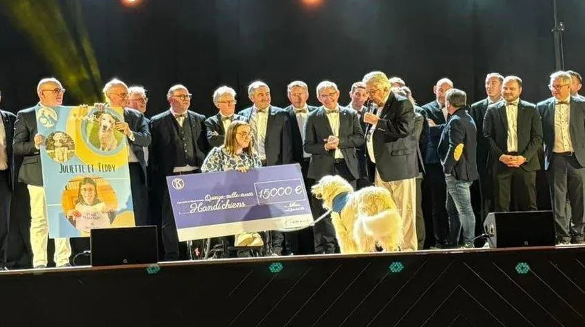 Pour les 40 ans du club, le Kiwanis a remis un chèque de 15 000 € à l’association Handi’chiens. © DR