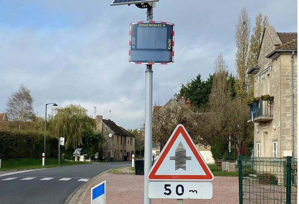 Le radar pédagogique, sur la route départementale qui traverse le village. © Ouest-France
