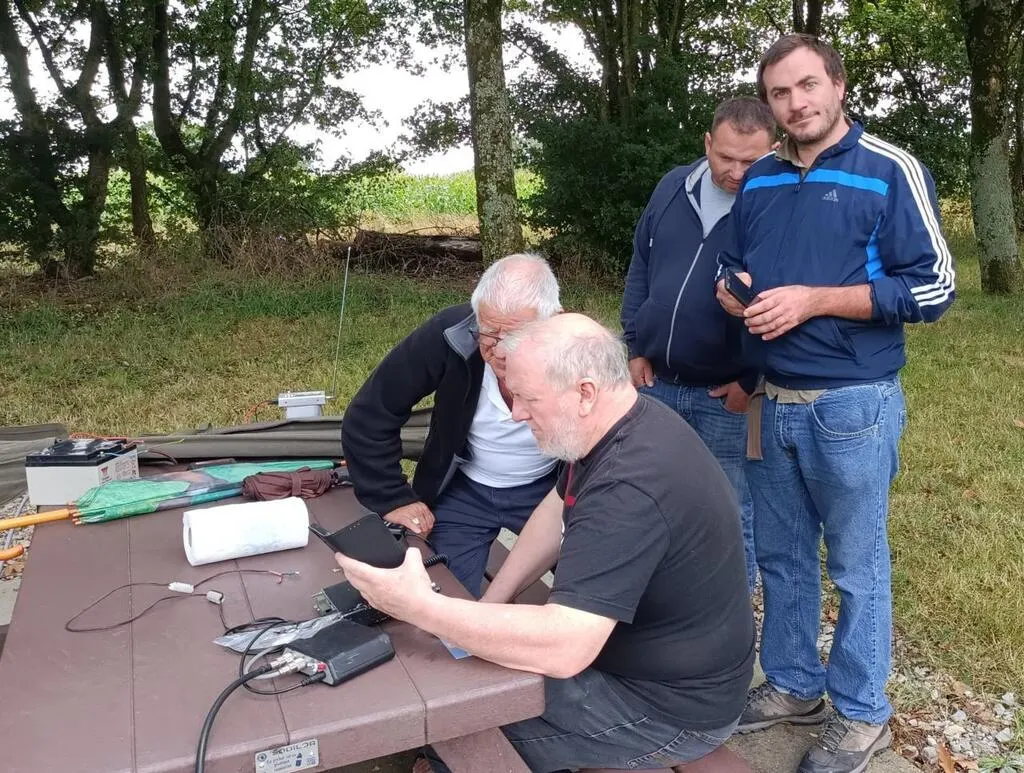 Plusieurs adhérents se sont retrouvés pour un pique-nique, après les averses et sous des rayons de soleil bien utiles car Mathieu Mostel, technicien de l’Adrasec, avait installé des panneaux solaires mobiles afin d’alimenter le matériel radio. Une antenne militaire américaine, de 10 m de haut et calée sur les fréquences radioamateurs, était reliée à un émetteur radio alimenté par une batterie, elle-même alimentée par les panneaux solaires. Toute cette installation a permis d’établir quelques contacts radio et de faire de l’écoute sur les différentes bandes radioamateurs.