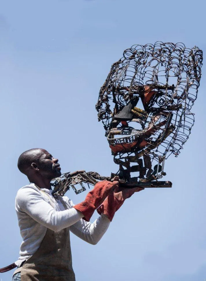 Dieudonné Foukou, présentant une de ses sculptures. © Kalbass’art