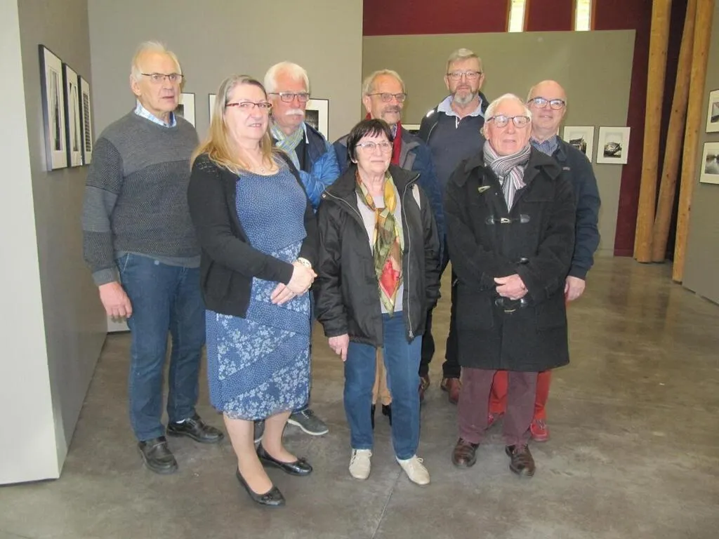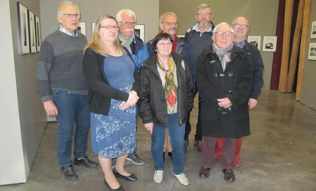 Au premier rang à gauche, Claudine Laîné, entourée de membres du club photo de la Petite A, lors de l’exposition de 2019 à la Roche d’Oëtre. © Archives Ouest-France