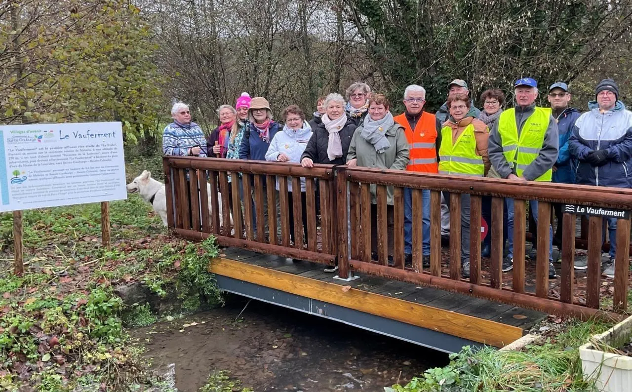 Les participants à la marche solidaire ont fait halte sur le petit pont de la Mare, entièrement réaménagé. © Ouest-France