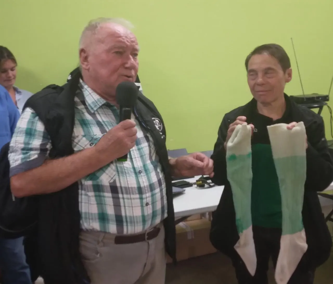 Des chaussettes du club ont été remises à la présidente Léone Rier, par un des plus anciens joueurs du club. © Ouest-France