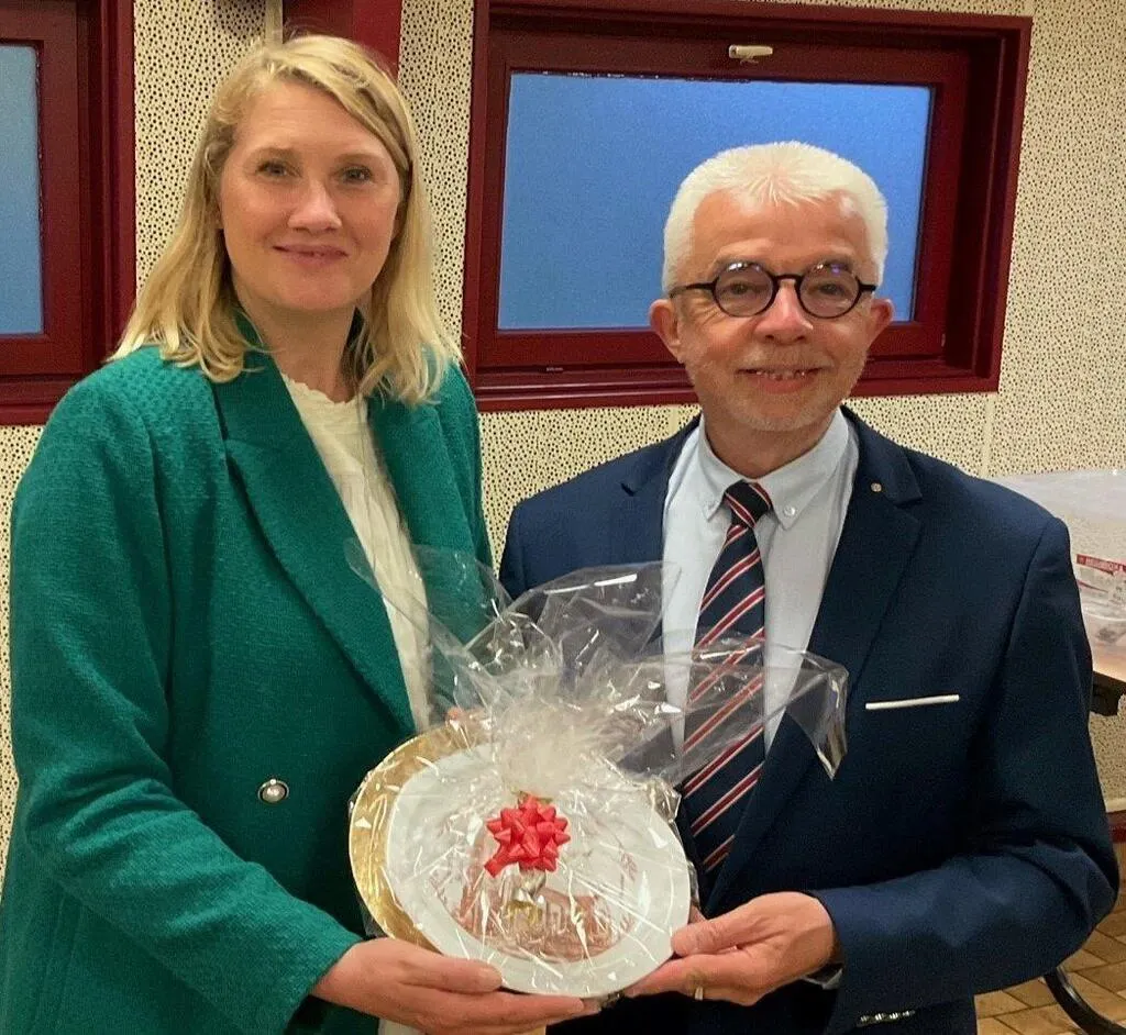 Julia Krügers, à la tête de la communauté de Schmitten depuis 2021, a effectué jeudi soir sa première visite à Sainte-Gauburge, où Philippe Bigot, maire, lui a offert un souvenir de la commune. © Ouest-France