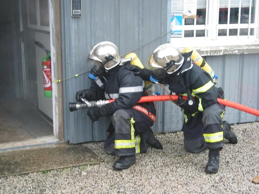 L’entrée des sapeurs-pompiers dans le bâtiment enfumé, en binôme, lors d’un exercice. © Ouest-France