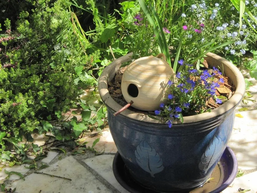 Des nichoirs sont à la disposition des oiseaux dans un bac à fleurs ou accrochés à un arbre. © Ouest-France