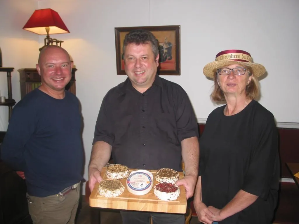 Vendredi 22 juillet, Dominique Vignot rencontrait Édouard Le Meur, chargé du développement de la fromagerie le Clos de Beaumoncel, à Camembert, et Hervé Legrand, chef du restaurant les Glycines, à Sap-en-Auge. Dans la dynamique du label Site remarquable du goût, une opération portée par la confrérie, dans la Communauté de communes des Vallées d’Auge et du Merlerault, a pour objet de promouvoir le camembert, par l’intermédiaire des métiers de bouche. Nous avons également remarqué que peu de fromages étaient consommés au restaurant