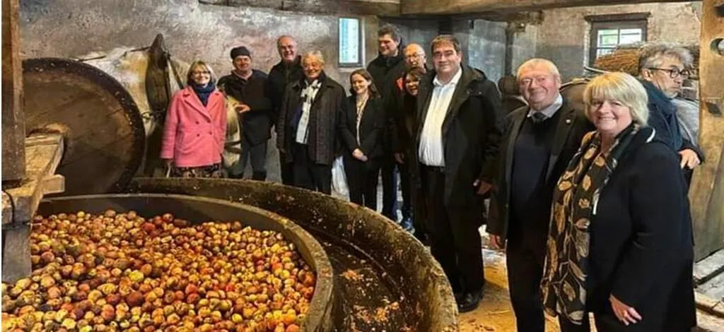Les personnalités devant le gadage en bois du XVIIIe siècle et le pressoir longue étreinte. © Ouest-France.
