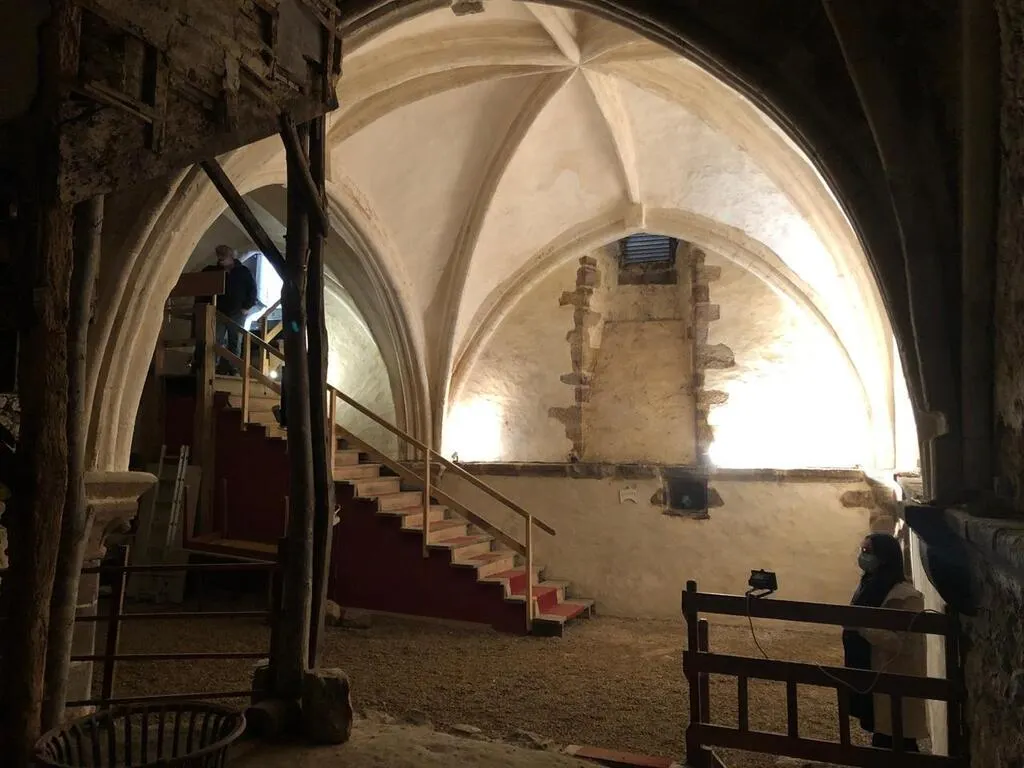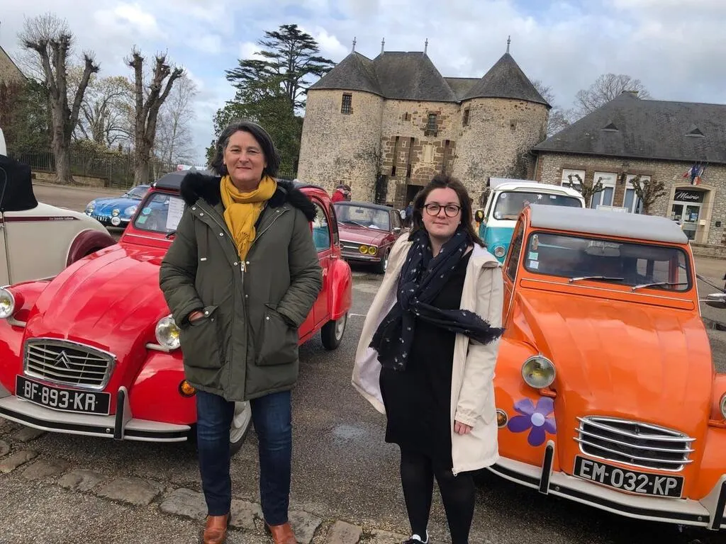 Fabienne Labrette-Ménager, maire, Laurena Salion, chargée de patrimoine. La commune accueillait samedi un rassemblement de voitures de collection. En arrière-plan, l’emblématique poterne du château. © Ouest-France