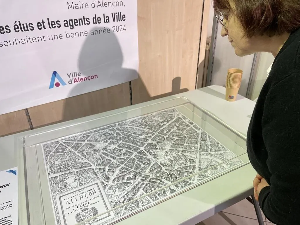 Une habitante découvre la carte de Pablo Raison à l’occasion des vÅ“ux du maire d’Alençon (Orne). © Ouest-France