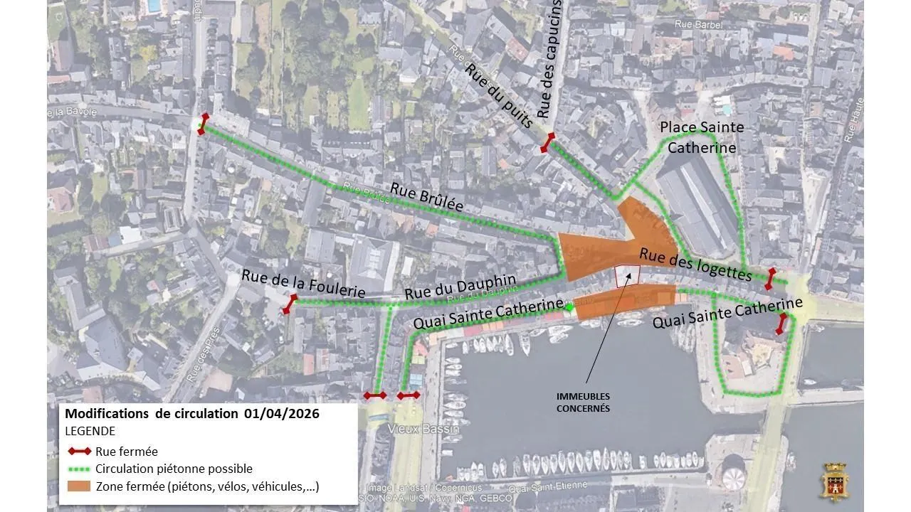 Pour une question de sécurité, les élus de Honfleur (Calvados) ont pris la décision, dans l’après-midi du mercredi 1er avril 2026, de fermer à la circulation les rues du Dauphin, des Logettes, du Puits (fermée jusqu’à l’intersection avec la rue des Capucins), et le quai Sainte-Catherine, à ses deux extrémités.