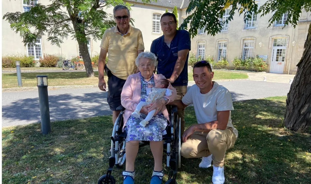 Autour de Nina : quatre générations. L’arrière-arrière grand-mère, Hélène, résidente de l’Ehpad de l’hôpital, vient de fêter ses 101 ans et Nina aura bientôt trois semaines. « Dans la famille, les naissances sont plutôt estivales ». L’arrière-grand-père, Michel, vient d’avoir 72 ans, le grand-père, Stéphane aura 50 ans le 1er septembre et le papa de Nina, Cyrille, a 27 ans. © Ouest-France