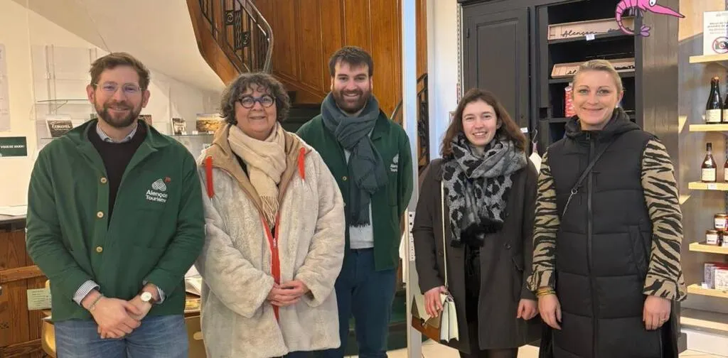 De gauche à droite : Charles Marceau, directeur, Fabienne Mauger, présidente, Willem Girond-Thuillier- responsable accueil pour l’office de tourisme d’Alençon, Marie Schnéppé, chargée de promotion touristique, et Marie-Caroline Malevicz-Labbé, pour l’office de tourisme de Sées. © Office de tourisme de Sées