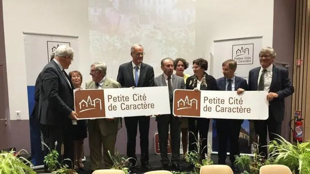 Le 21 septembre, la charte officielle des Petites cités de caractère a été signée entre Jean-Yves Houssemaine et Patrick Toularastel, délégué national de l’association. © Ouest-France