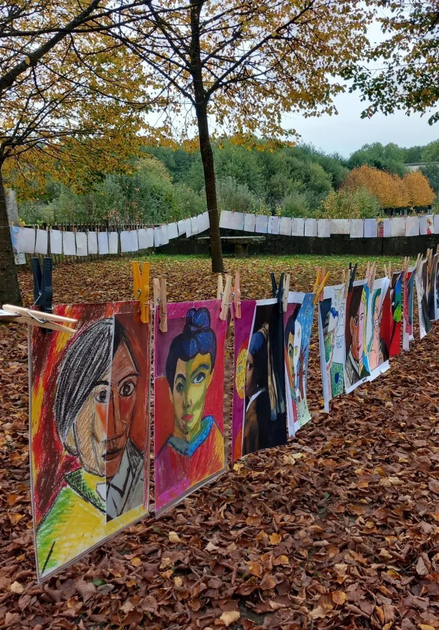 Le parc d’Argentré sert le temps d’un week-end de lieu d’exposition pour les dessins des élèves. © Ouest-France