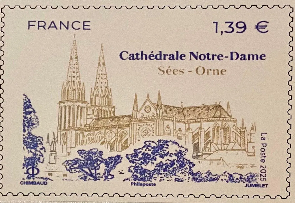 Le timbre de la cathédrale, commercialisé depuis l’été dernier par La Poste, illustre la carte de vœux 2026 des Amis de la cathédrale de Sées. L’association sera présente lors de la 3e édition du concert « En marche vers Noël », du dimanche 30 novembre, à 15 h. © Ouest-France