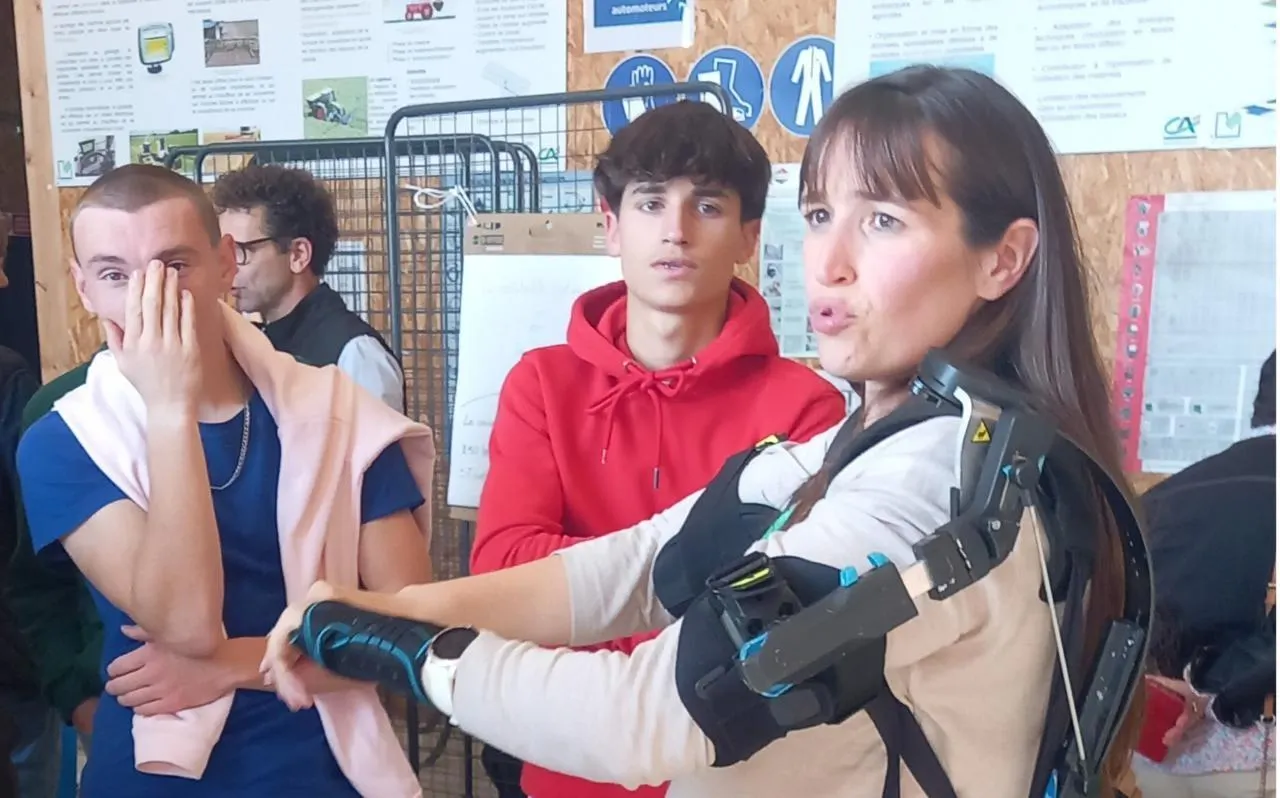 Parmi les innovations proposées, un exosquelette pour faciliter la traite des animaux. Mais il peut également être utilisé dans la taille des arbres ou encore dans le gavage des oies. © Ouest-France