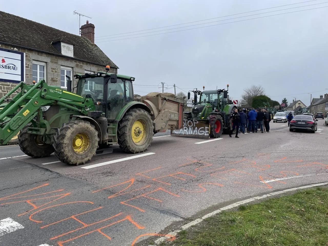 Près de trente tracteurs ont maintenu un barrage filtrant à Fromentel, dans l’Orne, ce lundi 15 décembre 2025. © Ouest-France